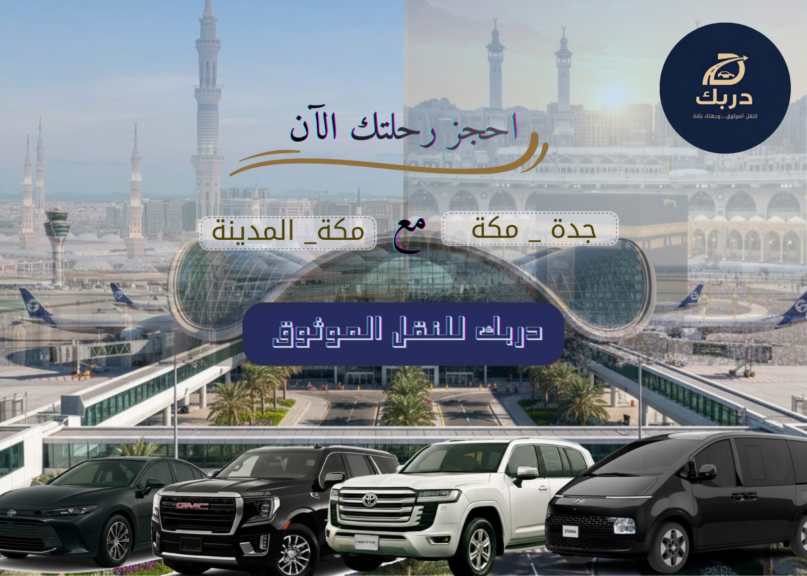 دربك هي شركة نقل بري فاخر سعودية 100%، مخصصة لتقديم خدمة استثنائية للحجاج والمعتمرين وزوار المملكة. نجمع بين التقاليد والحداثة لضمان أن تكون كل رحلة آمنة ومريحة ومميزة.